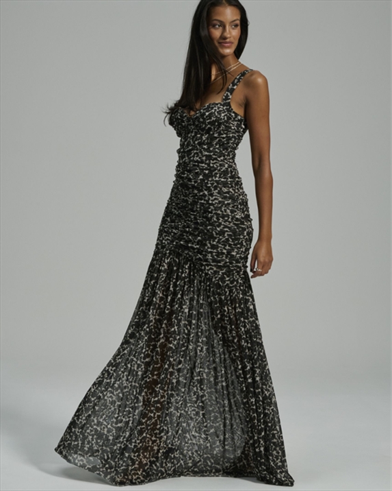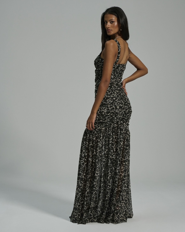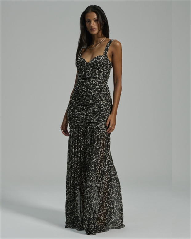The PROJECT SOMA Lavilia Dress is crafted from stretch tulle fabric. A maxi dress featuring boning and ruching details.