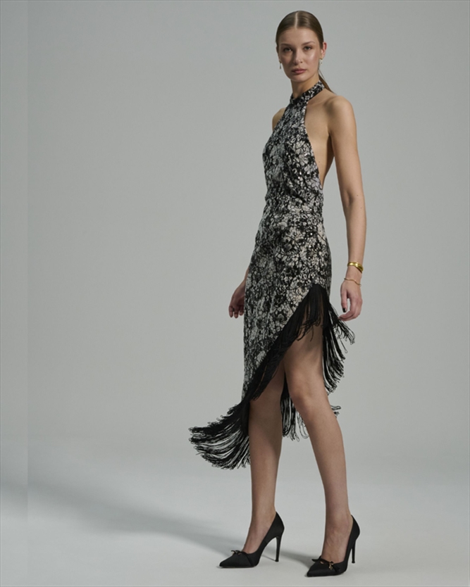 The PROJECT SOMA Lorena Dress is made of delicate lace with sequin detailing. A midi asymmetric dress featuring an open back and fringe accents.