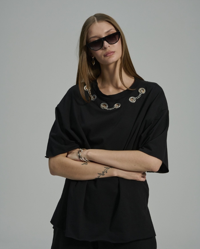 The PROJECT SOMA Rosina T-Shirt is made of brushed cotton fabric. An oversized t-shirt featuring stud details and a detachable chain.