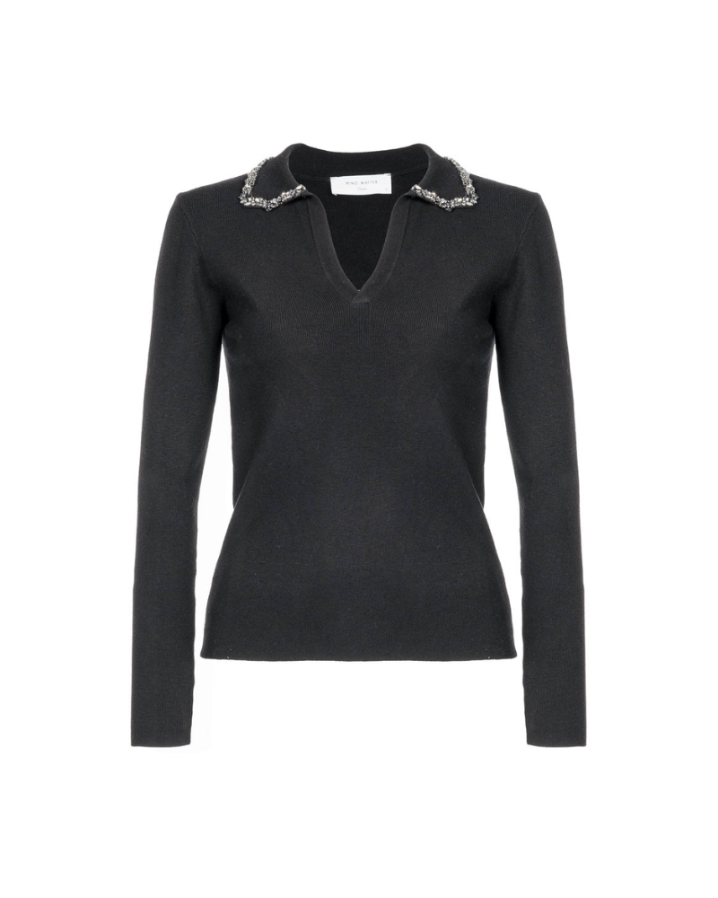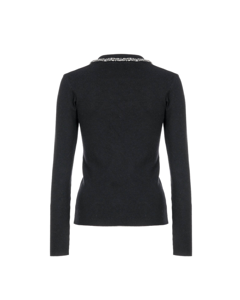 Λεπτομέρεια με κρύσταλλα στον γιακά – προσθέτει πολυτελή λάμψη και κάνει το πλεκτό να ξεχωρίζει.